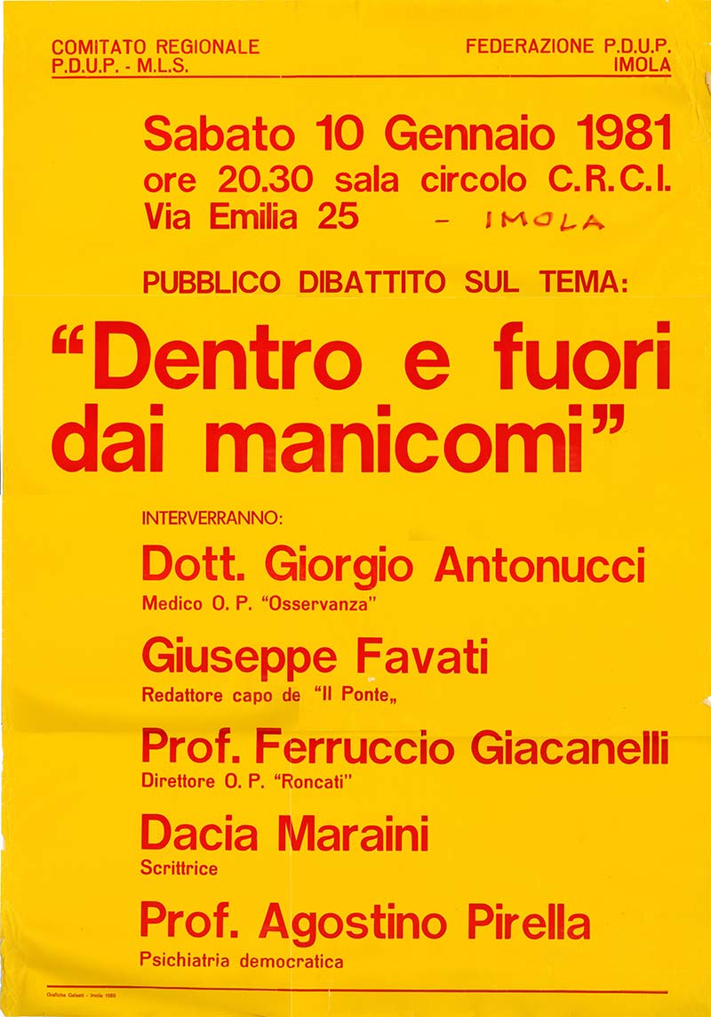Manifesti Problemi della salute in Montagna 9 dicembre 1972 No alla legge manicomiale 28 maggio 1977 Concerto all’istituo psichiatrico “Osservanza” 21 gennaio 1978 Festa di musica e poesia 8 dicembre 1979 Dentro e fuori dai manicomi 10 gennaio 1981 Dentro e fuori dai manicomi 12 giugno 1981 Concerto di Andrea Passigli 2 aprile 1982 No alle istituzioni totali 10 giugno 1982 Incontri sulla psichiatria marzo 1987